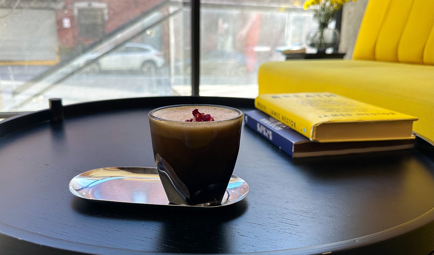 Once I walked inside, I was quickly greeted by a kind face that checked me in, offered me a menu and invited me to sit among the soft sunflower sofas, accompanied by tables that had books that waxed lyrical about breathing and sound. The menu presented a variety of options—from tonics to mix into my pre-float tea, to choices for background music during the float, and even drinks to savor afterwards. My brain was craving relaxation so I opted to have Happiness in my tea and Calming the Reactive Mind guided meditation.
